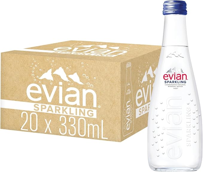 Evian sparkling 330 ml en botella de vidrio combina la pureza del agua mineral natural con una carbonatación delicada que aporta frescura y elegancia.